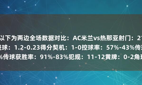 以下为两边全场数据对比:AC米兰vs热那亚射门:21-5射正:4-0预期进球:1.2-0.23得分契机:1-0控球率:57%-43%传球获胜率:91%-83%犯规:11-12黄牌:0-2角球:9-2体